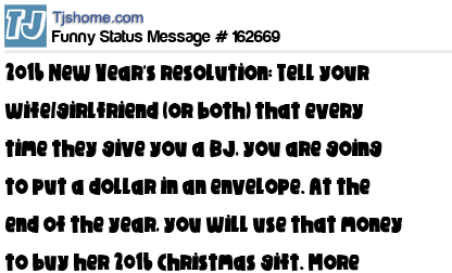 X says 2016 New Year's resolution: Tell your wife/girlfriend (or both) that every time they give you a BJ, you are going to put a dollar in an envelope. At the end of the year, you will use that money to buy her 2016 Christmas gift. More money = Nicer gift.