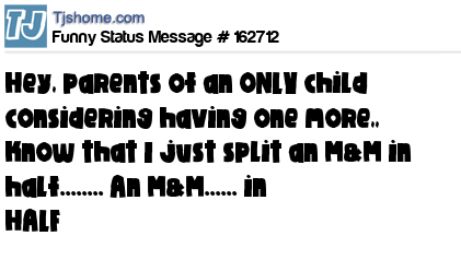X says Hey, parents of an ONLY child considering having one more,, know that I just split an M&M in half........ An M&M...... in HALF