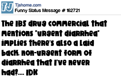 X says The IBS drug commercial that mentions "urgent diarrhea" implies there's also a laid back, non-urgent form of diarrhea that I've never had?.... IDK