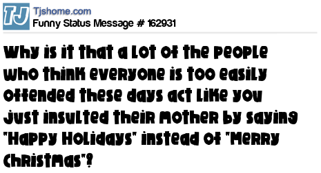 X says Why is it that a lot of the people who think everyone is too easily offended these days act like you just insulted their mother by saying "Happy Holidays" instead of "Merry Christmas"?