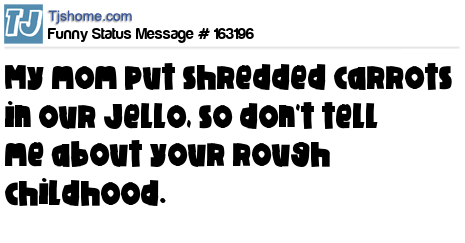 X says My mom put shredded carrots in our Jello, so don't tell me about your rough childhood.