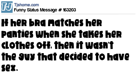 - # 166597 If her bra matches her panties when you take off her clothes, it wasn't you who decided to have sex.