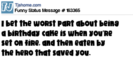 X says I bet the worst part about being a birthday cake is when you're set on fire, and then eaten by the hero that saved you.
