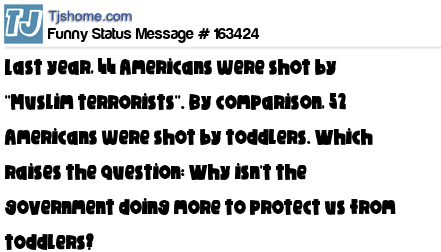 X says Last year, 44 Americans were shot by ''Muslim terrorists''. By comparison, 52 Americans were shot by toddlers. Which raises the question: Why isn't the government doing more to protect us from toddlers?