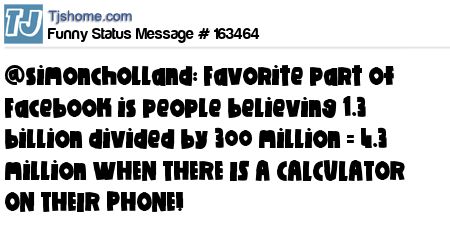 X @simoncholland: Favorite part of Facebook is people believing 1.3 billion divided by 300 million = 4.3 million WHEN THERE IS A CALCULATOR ON THEIR PHONE!