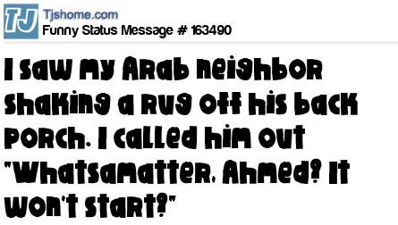 X says I saw my Arab neighbor shaking a rug off his back porch. I called him out "Whatsamatter, Ahmed? It won't start?"