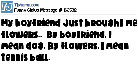 X says My boyfriend just brought me flowers..  By boyfriend, I mean dog. By flowers, I mean tennis ball.