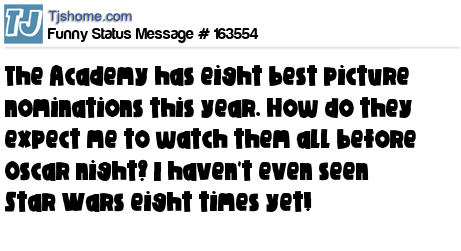 X says The Academy has eight best picture nominations this year. How do they expect me to watch them all before Oscar night? I haven't even seen Star Wars eight times yet!