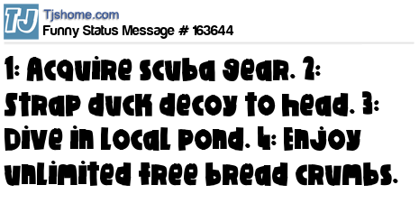 X says 1: Acquire scuba gear. 2: Strap duck decoy to head. 3: Dive in local pond. 4: Enjoy unlimited free bread crumbs.