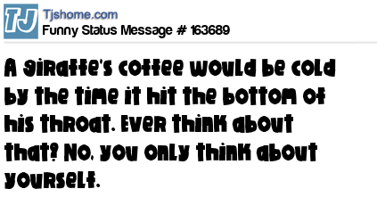 - # 157537 A giraffe's coffee would be cold by the time it reached the bottom of its throat. Ever think about that? No. You only think about yourself.
