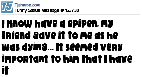 - # 160632 I just got a new Epi-pen. My friend gave it to me as he was dying. It seemed really important to him that I have it, for some reason.