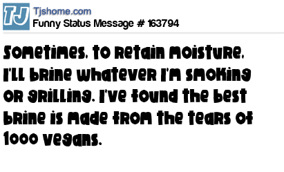 X says Sometimes, to retain moisture, I'll brine whatever I'm smoking or grilling. I've found the best brine is made from the tears of 1000 vegans.