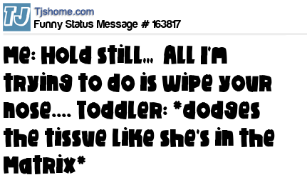 X says Me: Hold still,,, All I'm trying to do is wipe your nose.... Toddler: *dodges the tissue like she's in the Matrix*