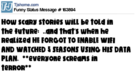 X says How scary stories will be told in the future: “..and that's when he realized HE FORGOT TO ENABLE WIFI AND WATCHED 5 SEASONS USING HIS DATA PLAN.” **everyone screams in terror**