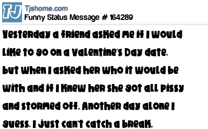 X Yesterday a friend asked me if I would like to go on a Valentine's Day date, but when I asked her who it would be with and if I knew her she got all pissy and stormed off. Another day alone I guess, I just can't catch a break.