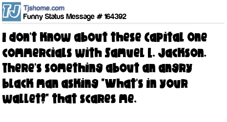 - # 164393 I don't know about these Capital One commercials with Samuel L. Jackson. There's something about an angry bl@ck m@n asking "What's in your wallet?" that scares me.
