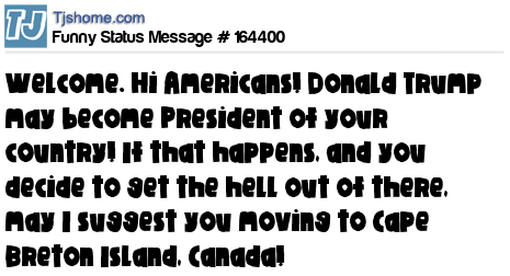 X says Welcome. Hi Americans! Donald Trump may become President of your country! If that happens, and you decide to get the hell out of there, may I suggest you moving to Cape Breton Island, Canada!