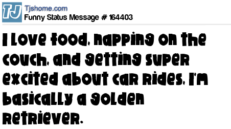 X says I love food, napping on the couch, and getting super excited about car rides, I'm basically a golden retriever.