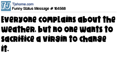 X says Everyone complains about the weather, but no one wants to sacrifice a virgin to change it.