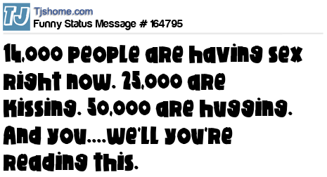 - # 12467 9000 people are having sex right now, 2000 are kissing, 100 are geting head and you are reading my status. Hang in there mate