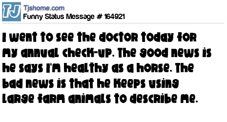 - # 164908 the good news is the doctor says I'm healthy as a horse, the bad news is she still uses large farm animals to describe me....