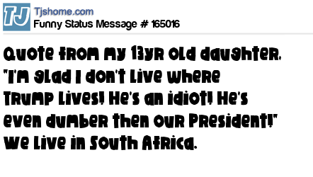 X says Quote from my 13yr old daughter, "I'm glad I don't live where Trump lives! He's an idiot! He's even dumber then our President!" We live in South Africa.
