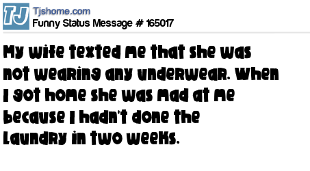 - # 184061 My wife texted me that she was not wearing any underwear. When I got home she was mad at me because I hadn't done the laundry in three weeks.