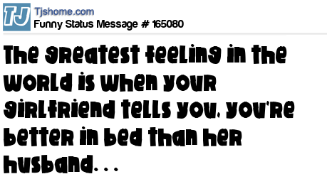 X says The greatest feeling in the world is when your girlfriend tells you, you're better in bed than her husband. . .