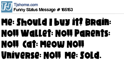 X says Me: Should I buy it? Brain: No!! Wallet: No!! Parents: No!! Cat: Meow NO!! Universe: NO!! Me: Sold.