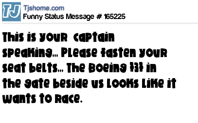 X says This is your captain speaking,,, Please fasten your seat belts,,, The Boeing 737 in the gate beside us looks like it wants to race.