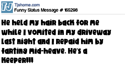 X says He held my hair back for me while I vomited in my driveway last night and I repaid him by farting mid-heave. He's a keeper!!!