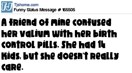 X says A friend of mine confused her valium with her birth control pills. She had 14 kids, but she doesn't really care.