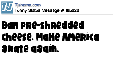 - # 170962 Donald Trump is starting a petition to stop the sale of pre-shredded cheese. He’s very serious about trying to make the USA grate again.