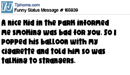 X says A nice kid in the park informed me smoking was bad for you. So I popped his balloon with my cigarette and told him so was talking to strangers.