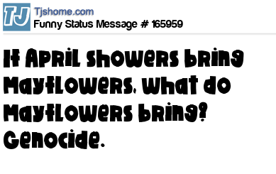X says If April showers bring Mayflowers, what do Mayflowers bring? Genocide.
