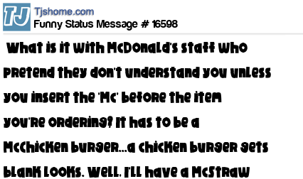 X   What is it with McDonald's staff who pretend they don't understand you unless you insert the 'Mc' before the item you're ordering? It has to be a McChicken burger...a chicken burger gets blank looks. Well, I'll have a McStraw and jam it into your McEyes,