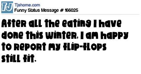 X After all the eating I have done this winter, I am happy to report my flip-flops still fit.