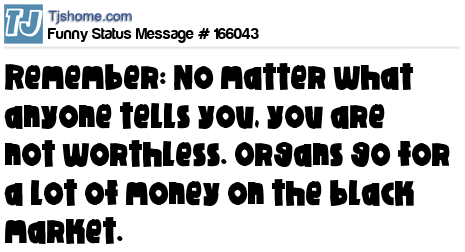 X says Remember: No matter what anyone tells you, you are not worthless. Organs go for a lot of money on the black market.