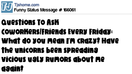 X says Questions To Ask Coworkers/Friends Every Friday: What do you mean I'm crazy? Have the unicorns been spreading vicious ugly rumors about me again?
