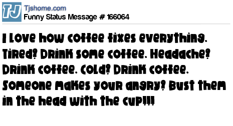 X says I love how coffee fixes everything. Tired? Drink some coffee. Headache? Drink coffee. Cold? Drink coffee. Someone makes your angry? Bust them in the head with the cup!!!