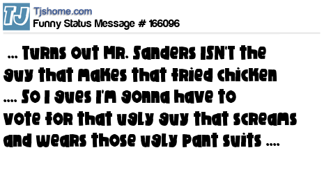 X ... Turns out Mr. Sanders ISN'T the guy that makes that fried chicken .... So I gues I'm gonna have to vote for that ugly guy that screams and wears those ugly pant suits ....