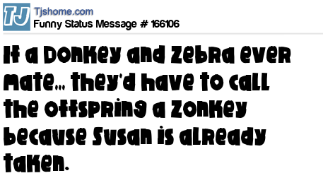 X says If a Donkey and Zebra ever mate,,, they'd have to call the offspring a Zonkey because Susan is already taken.