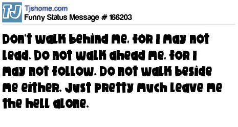- # 38288 Do not walk behind me, for I may not lead. Do not walk ahead of me, for I may not follow. Do not walk beside me either. Just pretty much leave me the hell alone.