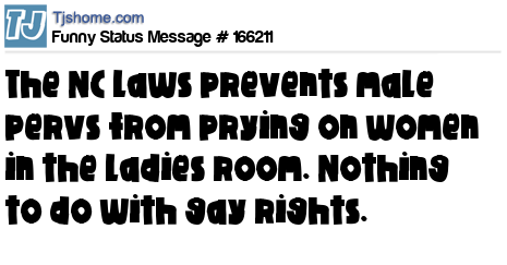 X says The NC laws prevents male pervs from prying on women in the ladies room. Nothing to do with gay rights.