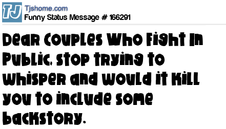 X says Dear Couples Who Fight In Public, stop trying to whisper and would it kill you to include some backstory.
