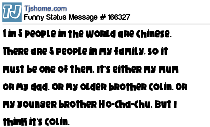- # 32945 Apparently, 1 in 5 people in the world are Chinese. And there are 5 people in my family, so it must be one of them. It's either my mum or my dad. Or my older brother Colin. Or my younger brother Ho-Chan-Chu. But I think it's Colin.