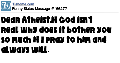 X says Dear Atheist,if God isn't real why does it bother you so much if I pray to him and always will.