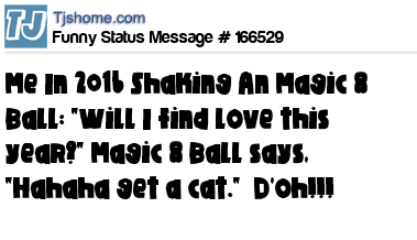 X says Me In 2016 Shaking An Magic 8 Ball: "Will I find love this year?" Magic 8 Ball says, "Hahaha get a cat." D'oh!!!