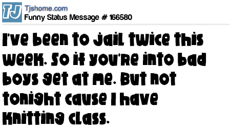 X says I've been to jail twice this week. So if you're into bad boys get at me. But not tonight cause I have knitting class.