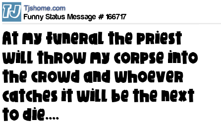 X says At my funeral the priest will throw my corpse into the crowd and whoever catches it will be the next to die....